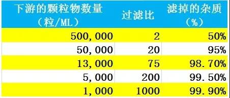 目前來說,表現過濾精度和過濾效果常見的指標是Beta值(β值),β值是過濾比,它是濾芯上遊和濾芯下遊油液中含有的一定尺寸顆粒物數量比值。 在檢測濾芯的過濾效果時,先使用顆粒物測量儀檢測濾芯上遊油液中,單位體積內的一定尺寸雜質顆粒數量、大小,然後測量濾芯下遊單位體積油液內的顆粒物數量、體積,然後把上遊的數量除以下遊的數量,得到的比值就是過濾比,例如:檢測濾芯上遊,尺寸大於5微米的顆粒物數量為10個。經過濾芯過濾後,下遊測得的5微米以上的顆粒物數量為1個,那麽相對於5微米這個精度級別,濾芯的過濾比就是10/1=10,標示為β5 =10。顯然,β值越大,說明過濾效果越好。選購濾芯時,除了看過濾精度,還要看過濾比。以5微米顆粒為例,如果上遊測量到的顆粒物為100萬個/ML,那麽對應的下遊數量和過濾比如下表:
